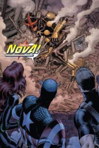 After awaking from his coma he would help fight to stop the Dark Phoenix from destroying Earth, this valiant effort would get him an offer to join the Avengers. Now that the hero community knew that a Nova was around once more, members of the New Warriors came to recruit Sam, as his predecessor had been a member of their team. Sam’s ego had grown due to his Avengers offer so he was ready to dismiss them until Uatu showed him how Richard Rider, the previous Nova, had been snubbed by the Avengers while the New Warriors were always welcoming to him. Sam decides to carry dual membership into both teams to have help wherever he can find it.